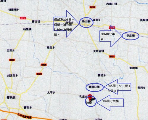 依地圖比例尺推估距離,一O二師兵力配置大致呈一個倒等腰三角形,304團(魏樓)與305團(韓道口)在南,兩團相距約4公里為兵力重點,距師部及306團各約20公里;306團(李莊)在東,距師部約15公里。