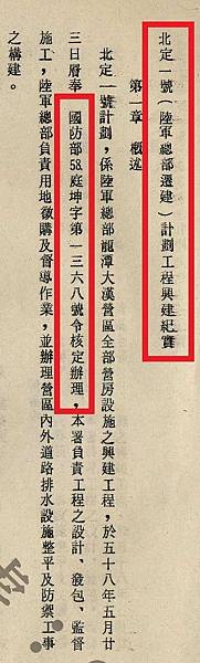 還有這張,聯勤總部工程署在完成陸軍總部遷建案後,向國防部呈報「北定一號計畫(陸軍總部)遷建工程興建紀實」。標題清楚寫的是「北定」不是「北碇」,而且北定計畫分兩個子計畫,陸軍總部遷建桃園龍潭是「北定一號」,聯勤總部遷建台北南港則是「北定二號」工程。