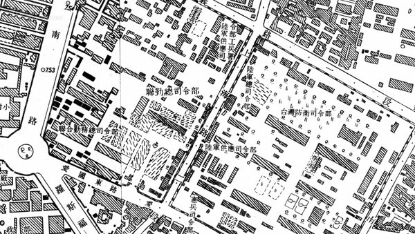 上圖台北市愛國東路以北、信義路以南、中山南路以東、金山南路以西的一大片營區,當年有陸軍總司令部(臺灣防衛總司令部於47年裁編)、聯勤總司令部、陸軍供應司令部及憲兵司令部等單位,愛國東路南側還有中央警官學校,裝甲兵旅司令部撤台之初也曾短暫停駐於此。民國50年代末期各單位陸續遷走,原訂要在此興建台北市金融商業核心區CBD,但是民國65年蔣中正總統去世後,此區域改建為中正紀念堂與國音樂戲劇廳院;CBD移至三張犁,也就是現在的信義計畫區。(圖片來源不詳,如有侵權請告知,將立即移除。)