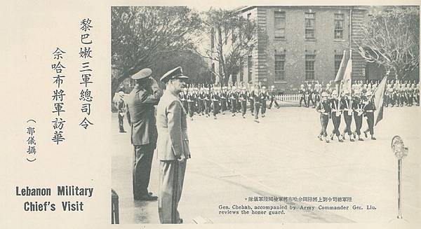 民國52年陸軍總司令劉安祺在上海路陸軍總部舊址操場陪同黎巴嫩三軍總司令檢閱陸軍儀隊。(圖片來源:勝利之光月刊97期,民52年1月。)