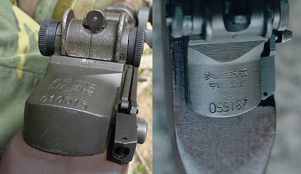 五七式步槍的刻字有分前、後期兩種,圖左為前期型第一行「步槍七六二」、第二行「57式國造」、第三行為聯勤60廠徽記、第四行為六位數槍枝號碼;圖右為後期型第一行「步槍七六二57式」、第二行「中華民國造」、第三、四行與前期型相同。