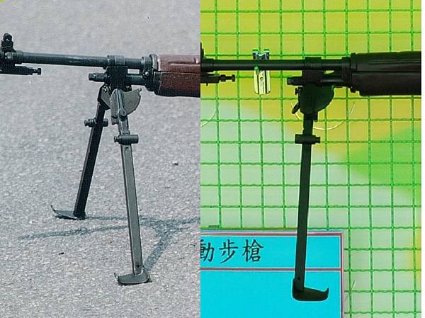 五七甲式兩腳架原來是向後摺疊,但摺疊後肩槍時腳架抵住右後肩背部,極不舒適,因此部隊中常見將腳架反裝,改為向前摺疊。圖左為反裝向前摺疊的兩腳架,駐鋤底板向前;圖右為向後摺疊,駐鋤底板向後。