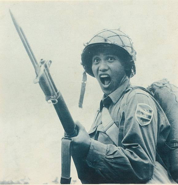 民國50年代手持M1步槍,左臂配戴雄獅隊徽的步兵第69師士兵,69師源於青年軍207師,一脈相傳至現今的機步269旅。58年7月陸軍嘉禾案改編,將前瞻步兵師改編為重裝步兵師,以步兵第69師為試驗部隊,開始為期11週的改編訓練,69師也因此被選為第一個換裝國造57式步、機槍的步兵師。(圖片來源:中國陸軍畫刊,第50期,民54年10月。)