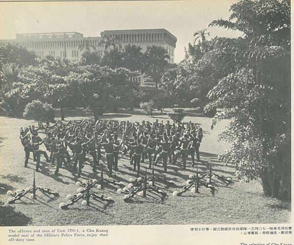 民國63年憲兵莒光連隊,地上架槍的明顯為五七式步槍,而非當時憲兵編制的卡賓槍。照片背景為當時剛落成的外交部大樓,可見拍攝地點為台北賓館庭院,圖中憲兵則是提前換裝五七式步機槍的憲兵201指揮部賓館連。(圖片來源: 勝利之光月刊,237期,民63年9月)